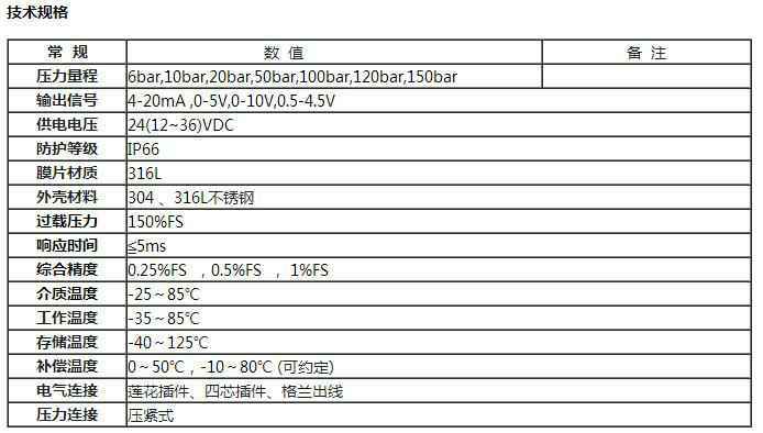 额定量程:6bar,10bar,20bar,50bar,100bar,120bar,150bar